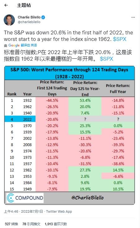 上分享了一张图表,显示标准普尔 500 指数在 2022 年上半年下跌了 20.6%,这是该指数自 1962 年以来最糟糕的年度开局,当时价格回报率为