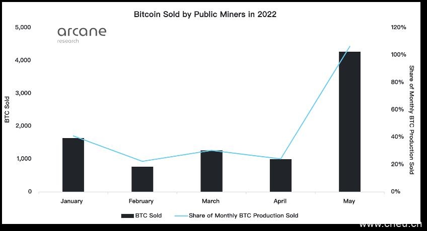 的比特币产量。矿业盈利能力的暴跌迫使这些矿工在5月份将销售率提高到其产量的100%以上。