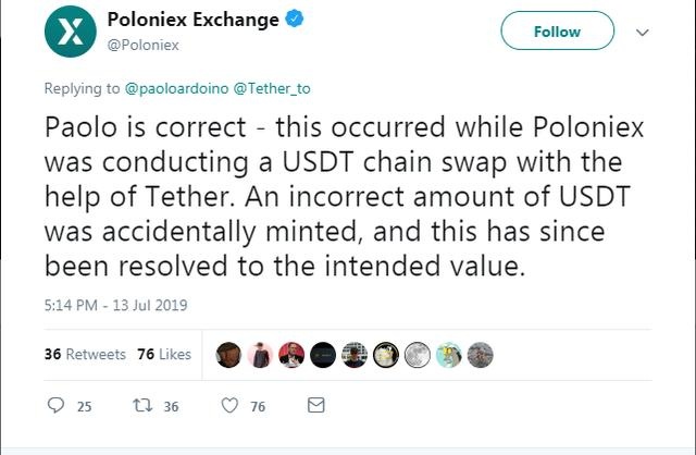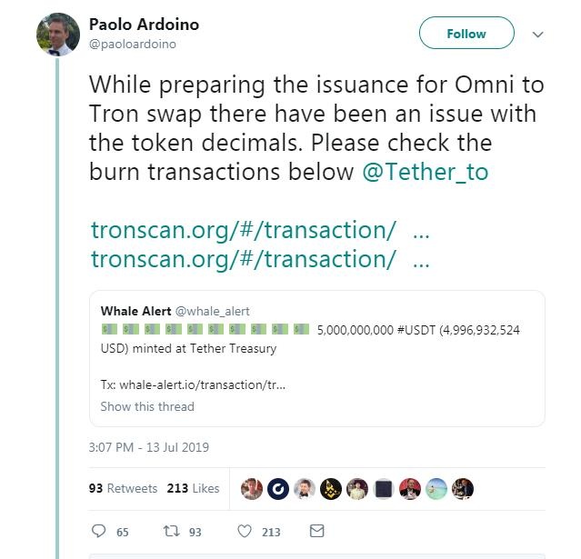 报道称导致这个失误的原因是Tether团队最初正在将代币从Omni层移动到Tron区块链,但由于有人操作失误,小数点位置错误,本应发行5000万枚USDT变成了50亿USDT。Bitfinex和Tethers首席技术官Paolo Ardoino解释说,在意外代币可能扰乱全球加密市场之前,他的团队立即烧掉了它们。