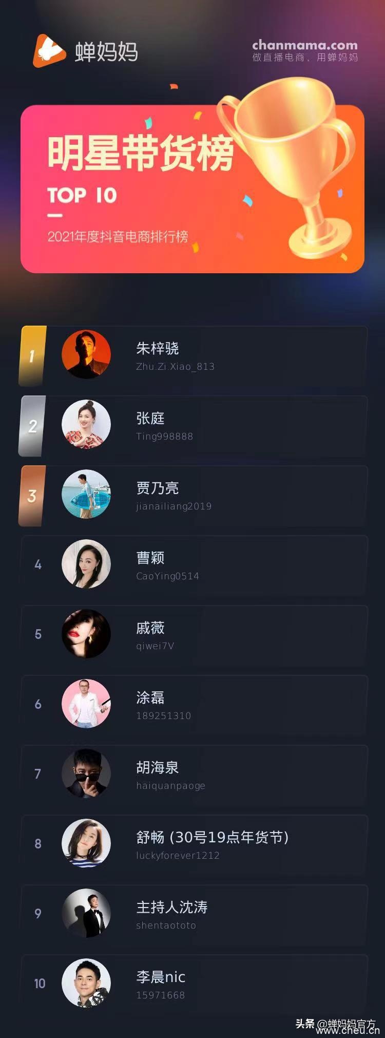 曹颖、戚薇、涂磊、胡海泉、舒畅、主持人沈涛、李晨nic等明星主播,在过去的2021年,不断调整自己的直播场所,为粉丝和消费者提供了良好的低消费体验,成功跻身榜单前十。