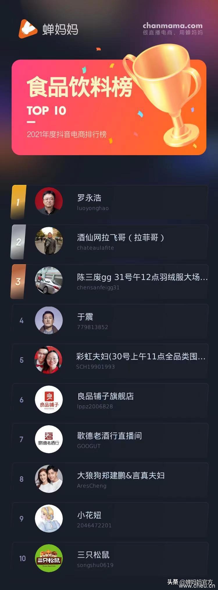 新年第一天,妈妈Chan为您准备了15份行业权威榜单TOP50,不仅包括直播榜、明星榜、品牌自播榜、店播达人榜、品牌销售榜等。,这些都是大家非常关心的;还有10个垂直赛道行业榜单TOP50,将为你解析服装、美妆、食品行业的黑马主播,让你不要错过向优秀同行学习的机会。