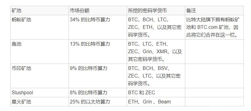有一些矿池专注于挖特定的密码学货币(例如星火矿池,专注于以太坊和 Grin),而其他矿池则设置了多种矿池,覆盖了所有主流的密码学货币(蚂蚁矿池,鱼池,币印矿池,Slushpool,等等)。所有的这些矿池一开始都是专注于挖一个密码学货币(通常是比特币),后来才扩展到涵盖所有形式的密码学货币。