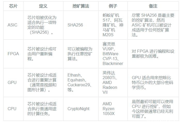 目前,比特币生态系统内的矿机由专用集成电路(ASIC)主导。对于其它绝大多数密码学货币而言,图形处理器(GPU)和现场可编程门阵列(FPGA)是主要的矿机形态。还存在许多和比特币使用同一种哈希算法(SHA256)的密码学货币,它们也兼容比特币的 ASIC 矿机。