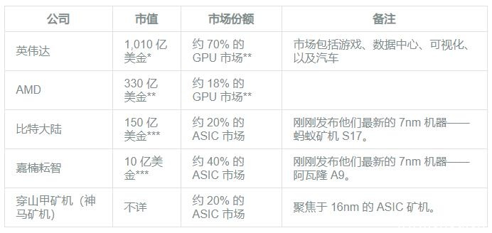 对于 GPU 而言,最顶级的两个制造商是英伟达和 AMD。而对于 FPGA 而言,最顶级的制造商是赛灵思。对于专门用来进行密码学货币挖矿的 ASIC 芯片而言,最顶级的三家制造商则是比特大陆,嘉楠耘智,和穿山甲矿机(Pangolin Miner)(神马(Whatsminer)矿机系列的制造商)。