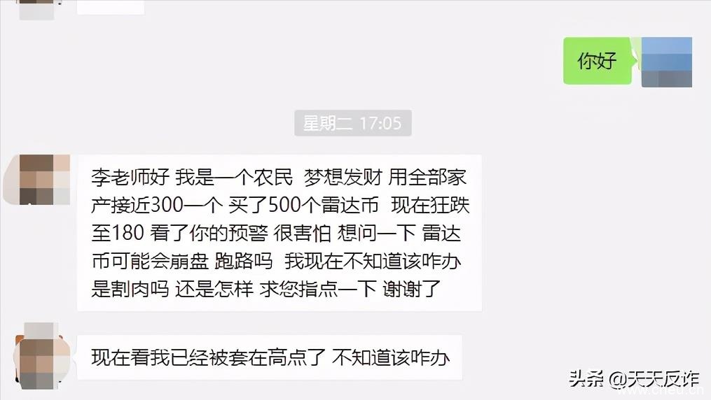 就是前几天有读者加我微信,问我雷达币的事。我还没有回答她。我也不知道怎么回复她。剩下的只有心痛。一个普通家庭用全部家产买了500枚雷达币。现在币的价格已经被砍成韭菜了。是止损还是等待价格上涨?我该怎么办?我的意思是告诉这位读者,你该割肉还是不割肉,但我不忍心说,几万块钱对一个农民家庭来说不算少。但毕竟雷达币本身不合规,崩盘只是时间问题。等平台跑了,就一地鸡毛了。