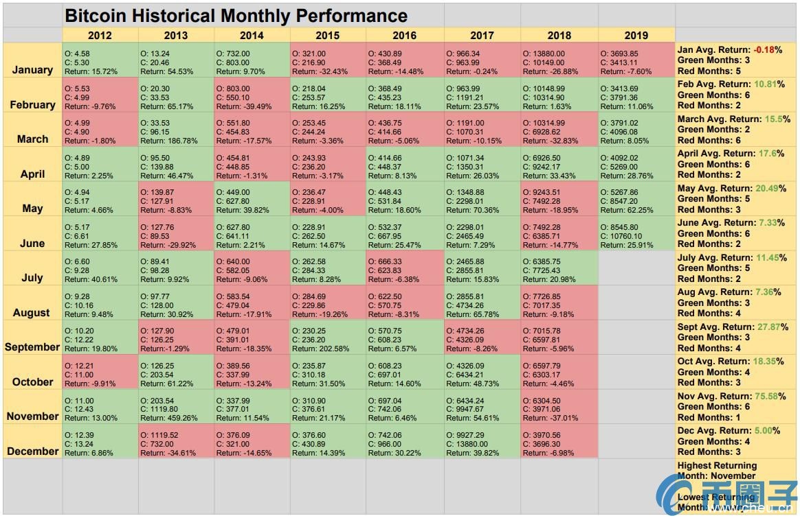 自2012年以来,历史价格走势表明,1月是比特币表现最差的月份,11月可能是牛市的最佳预兆。Twitter用户@Bitdealer_研究表明,自2012年以来,比特币价格每月变化的平均回报计算了2012年1月至2019年6月7日半的数据。