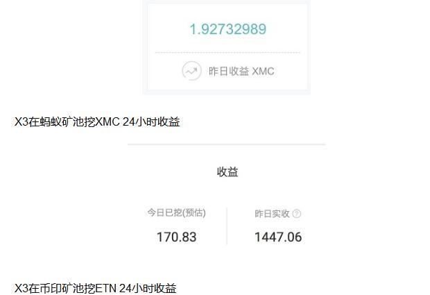 按每度电0.5元计算,X3一天用12度电,电费6元左右。XMC日利润约109元,挖ETN日利润约254元。