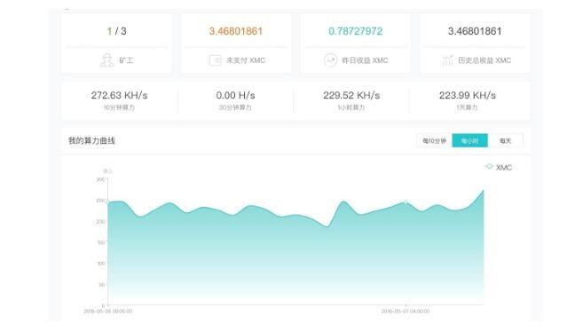 截止日期(2018年5月7日)XMC价格在60元左右,根据蚂蚁矿池PPS采矿收入模式,一个X3一天24小时的收入是1.92个XMC,折合人民币115元;