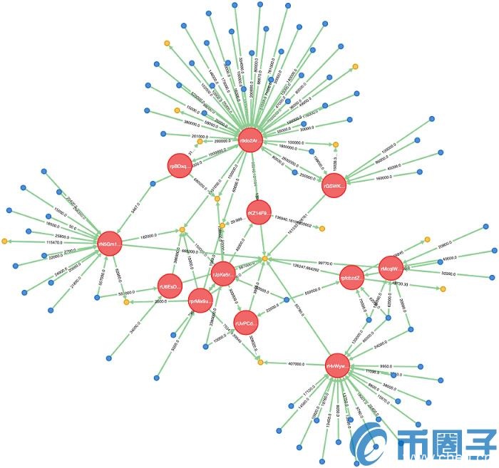 如上图所示,黄色代表被盗瑞波货币的加密货币交易中心和账户;蓝色代表受害者;红色代表九个可疑账户。(星球君 o-daily 注:部分受害者可能直接将资金发送到交易中心,而不是通过可疑账户转账)