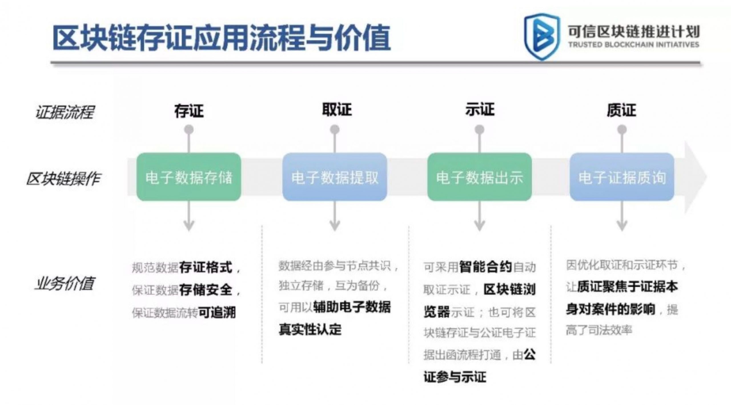 白皮书还分析了区块链在电子证据的不同环节中的作用。区块链可以提供标准化的数据存储格式、原始数据保证、安全存储和可追溯性,提高证据的可信度;第二,区块链的价值是参与节点共识、独立存储和备份,辅助电子证据的真实性识别;第三,智能合同和区块链浏览器;最后,区块链可以固化证据收集和证据,整个过程可以追溯。