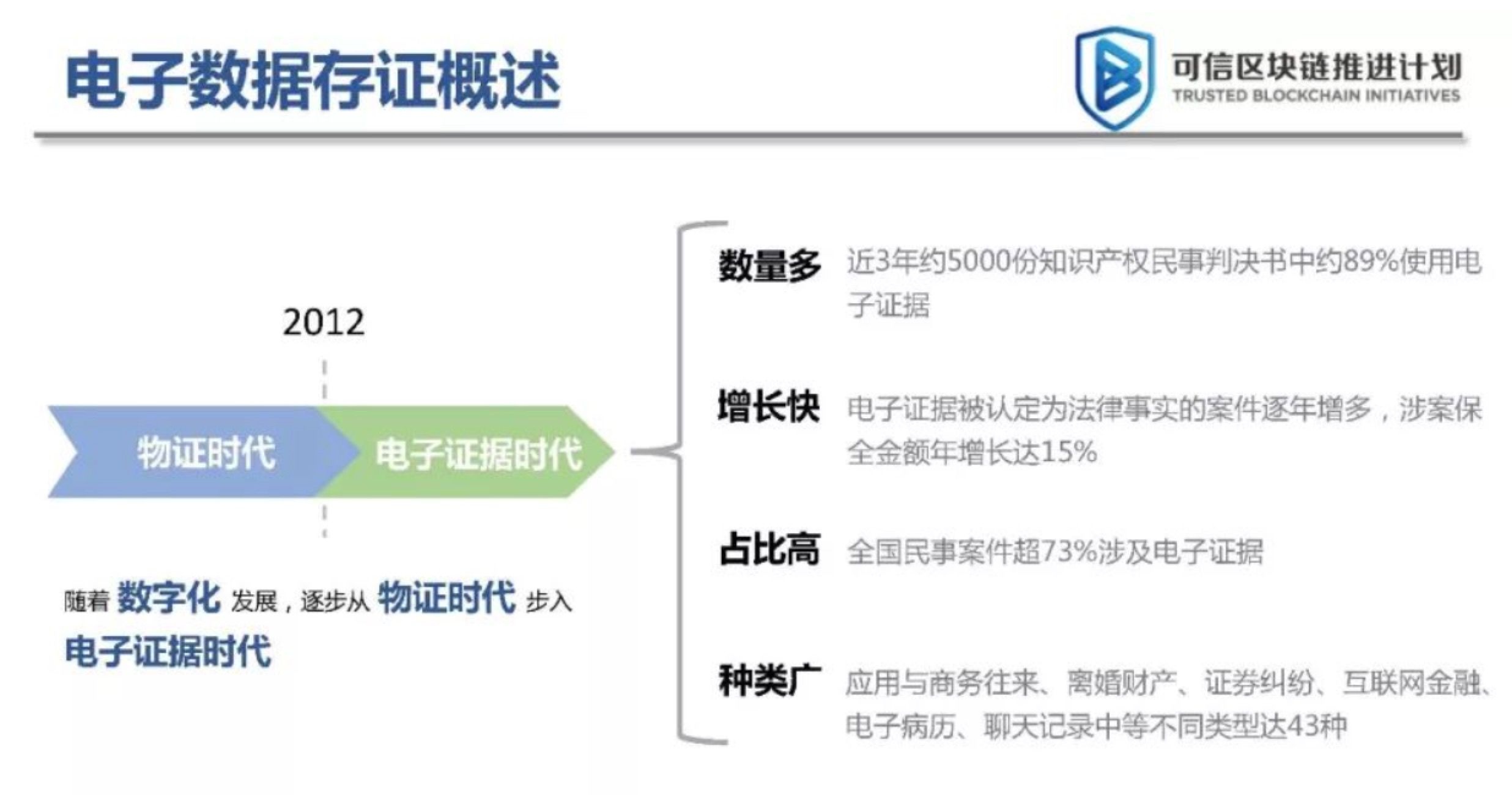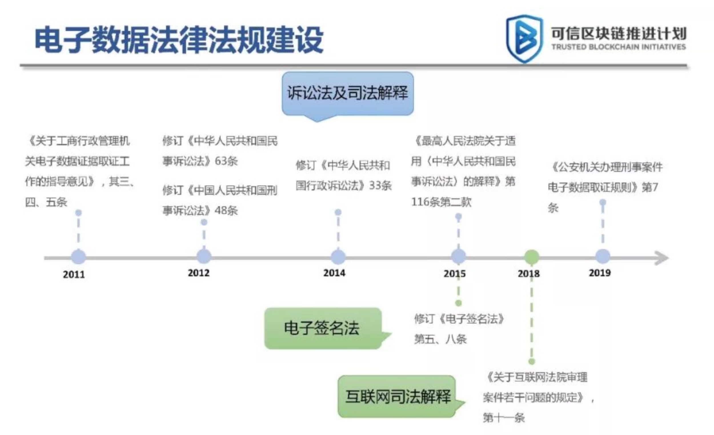 回顾中国电子数据法律法规的发展,相关文件于2011年关注电子数据证据的收集。2012年和2014年修订的三项诉讼法明确了电子证据作为独立证据的法律地位。2018年,最高法院发布了《互联网法院审理若干问题的规定》,指出区块链可以解决电子证据的存储问题,并支持使用新技术来解决司法行业的痛点。