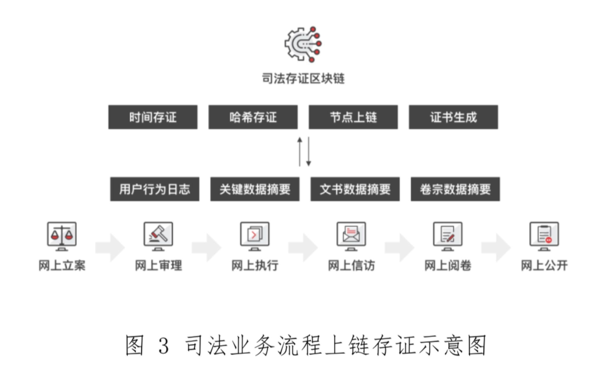 此外,为了提高系统的可用性,连接司法业务场景,区块链可以结合电子身份认证、时间戳服务、数据加解密、数据存储、智能合同执行等相关技术。
