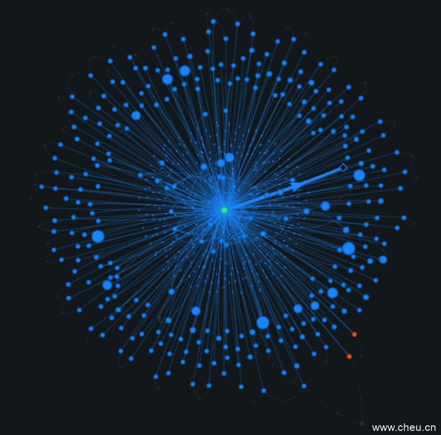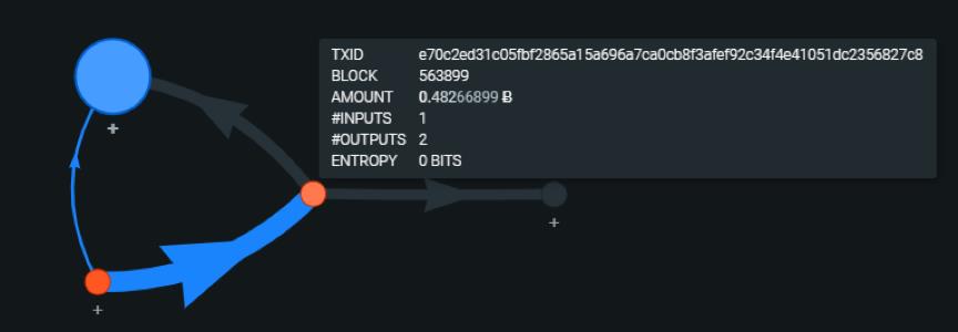 让我们回到之前列举的那笔交易 e70c2ed31c05fbf2865a15a696a7ca0cb8f3afef92c34f4e41051dc2356827c8。现在我们可以立即看到这笔交易的资金来源,我们的交易(红点)都已被用于资助第三笔交易(蓝点)。