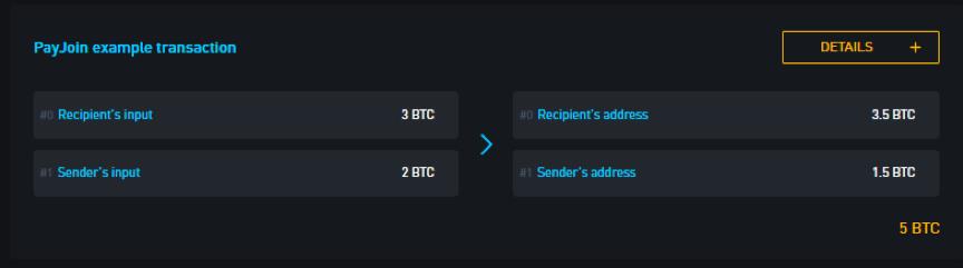 Wasabi 钱包的混币交易 交易ID从左到右分别为 72046c65fa25724f11c91f35799f69b66072bc07b2b4e3fc363852c2506b2b90, d7a428a8e3d69f236519cb999dbcb47b3b283548875371da567259be806e35ea, 20cf4fa2f685167f46682dd30c7720a06618656939fadbd1f20e3d471d08dfbb (oxt.me).因为这些交易都有看起来很奇怪的等量的资金输出,这些交易就更容易被分辨,并且可以更轻易地从群集分析工具中删除。当用户希望向外界混淆支付的资金来源和支付发送的目的地时,等额的混币交易就可以理解为混淆器。最近的一项名为PayJoin或Pay-to-EndPoint(P2EP)的项目也使用了相同的原理来创建与平常交易无法区分的交易。这种新兴的交易类型混合了来自付款人和收款人的资金输入,并且在实际支付某些东西时,将支付金额从发送者的输出资金直接转移到接收者的输出中,由此来支付接收者相应的金额。