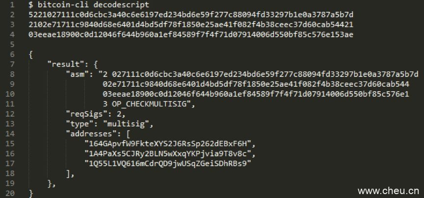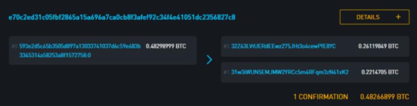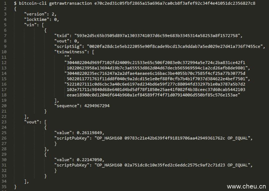 e70c2ed31c05fbf2865a15a696a7ca0cb8f3afef92c34f4e41051dc2356827c8. 的资金来源我们可以从解码的原始数据进一步解码交易的内容,例如从txinwitness中了解更多有关资金来源的信息。Txinwitness中的最后一行16进制的字串符显示了2-of-3的多重字符脚本,这是我们可以推断出这可能使用一个交易中心的钱包。