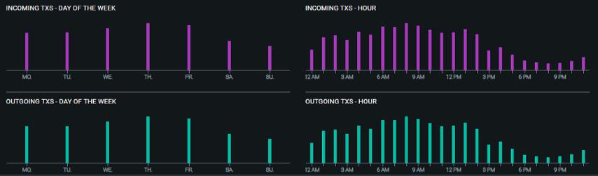:00-22:00UTC是该地址活动最少的时间段,一个合理的假设是这段对应控制该地址的人的当地时间的01:00-05:00或者02:00-06:00。考虑到改地址的活跃时间段、交易量以及多签/名设置情况,可以猜出该地址属于位于GMT+7/8的时区。