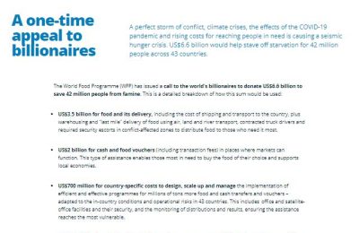 联合国世界粮食计划署(WFP)周一(11月15日)向全球亿万富翁发出呼吁,请求他们一次性捐赠66亿美元,让4200万...